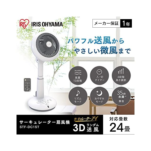 アイリスオーヤマ サーキュレーター扇風機 上下左右首振り 24畳 パワフル送風 DCモーター リモコン付き ホワイト STF-DC15T