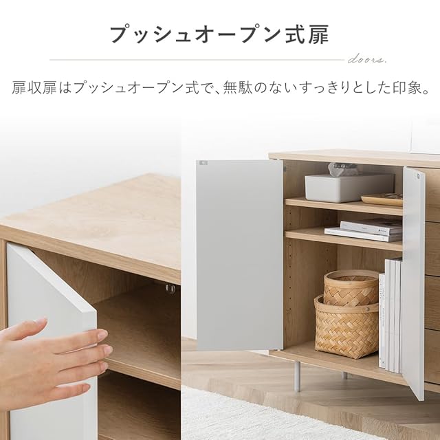 開け閉めがスムーズなプッシュ式。左扉収納部には11段階調節可能な可動棚2枚付き。