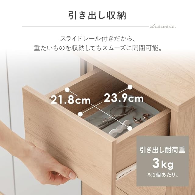 たっぷり入る、2つの引き出し。大小二つの引き出し付き。使い分けてすっきり収納。
