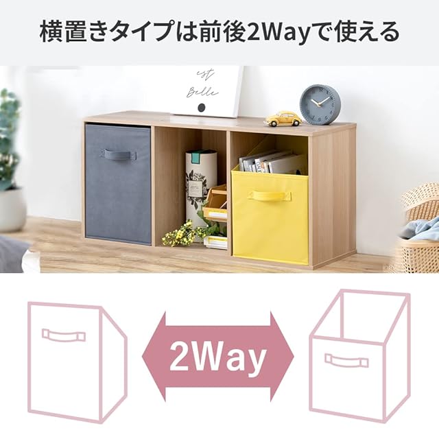 耐荷重:約6kg ●材質/側地:不織布(ポリプロピレン100%)/芯材:紙 ●タイプ:横置き ※「縦置きタイプ」「横置きタイプ」の表記は、CBボックスをタテ向きに置いて使用する場合とヨコ向きにおいて使用する場合を意味しています。