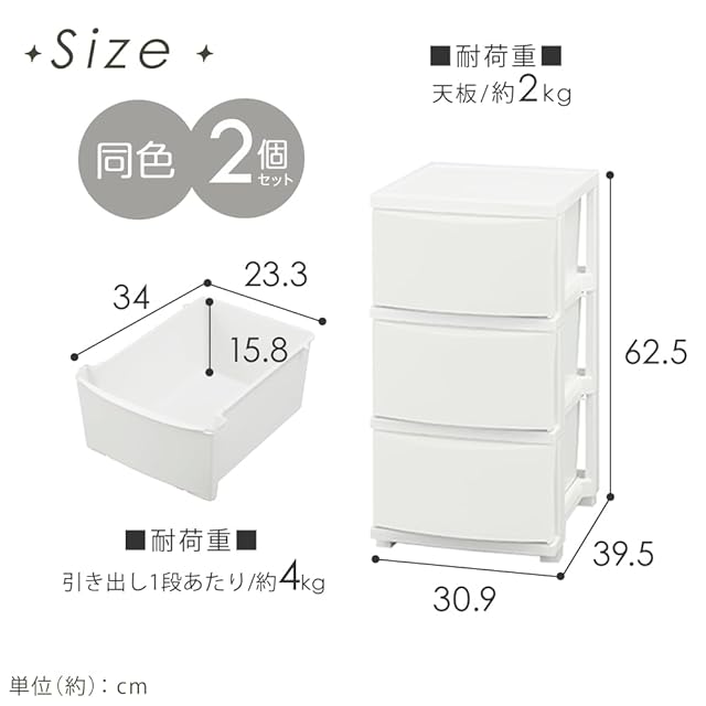 収納目安(引き出し1段あたり)は「Tシャツ:約20枚」または「バスタオル:約8枚」。