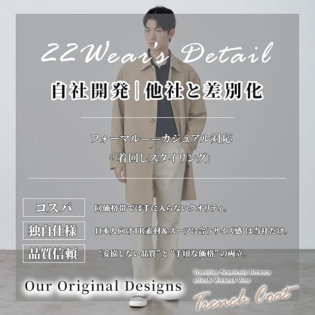 【スーツに重ねて美しい「上質TR素材」】ビジネスシーンではずかしくないトレンチコートを追求し、ビジネスジャケットと同じ高密度TR素材(ポリエステル80%・ビスコース20%) を採用。一般的なポリエステル100%コートとは異なり、光沢感・ドレープ性・通気性 を向上。厚すぎず薄すぎない春秋用最適ウェイト。秋の涼しい日から春先まで、体温調節しやすい適度な防風性と保温性。「スーツの上から羽織っても型崩れせず、ビジネスマンの“品格”をキープ」 ことが当商品の強みです。