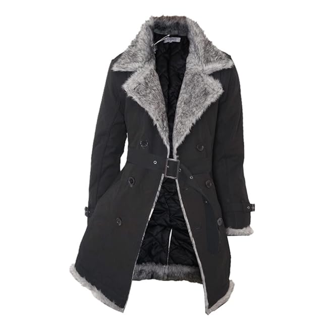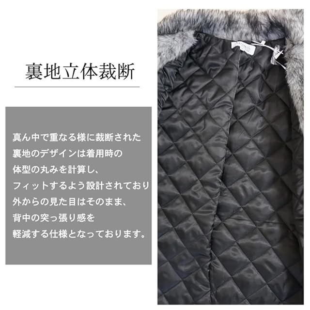 襟周りから身頃に沿って裾周りにぐるりとシルバーMIXファーを配置した中綿入りトレンチコート<br> お尻が隠れるロング丈で大きめの襟とウエストを絞れる腰ベルトでスタイリッシュなシルエットが特徴的<br> ポケットは両腰についたサイドポケットが2カ所で後ろ肩のウエスタンラインの切り替えには大きめのボタンを配置<br> ※ファーの取り外しは出来ません。<br> 真ん中で重なる様に裁断された裏地のデザインは着用時の体型の丸みを計算し、<br> フィットするよう設計されております。<br> 外からの見た目はそのまま背中の突っ張り感を軽減する仕様となっております。