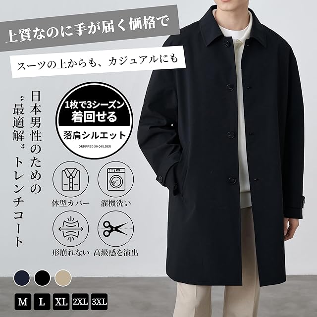 【スーツに重ねて美しい「上質TR素材」】ビジネスシーンではずかしくないトレンチコートを追求し、ビジネスジャケットと同じ高密度TR素材(ポリエステル80%・ビスコース20%) を採用。一般的なポリエステル100%コートとは異なり、光沢感・ドレープ性・通気性 を向上。厚すぎず薄すぎない春秋用最適ウェイト。秋の涼しい日から春先まで、体温調節しやすい適度な防風性と保温性。「スーツの上から羽織っても型崩れせず、ビジネスマンの“品格”をキープ」 ことが当商品の強みです。