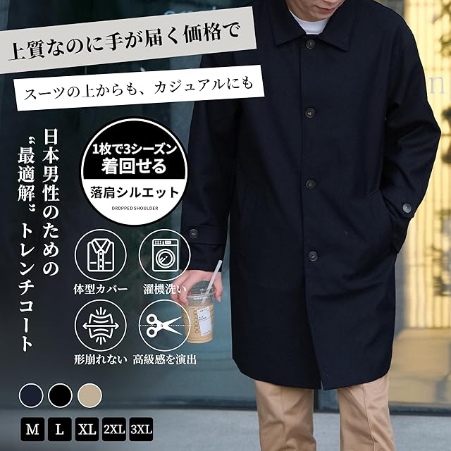【日本人の体型を研究した「修正落肩シルエット」】「体型カバー」と「スーツとの相性」を両立した一着です。落肩デザインでありながら、肩幅が広すぎない「アジアンサイズ」調整、 小柄な方でも着丈がダブつかず、すっきり見える。背中に「余剰ゆとり」を加えた立体裁断 で、スーツや厚手セーターを着込んでも膨らまず、動きやすく、皺になりにくい。高級感を演出。裾はゆったりとしたAラインシルエット、と膝上の中丈感はスーツとのバランスがよく、かつ上品感をキープ。