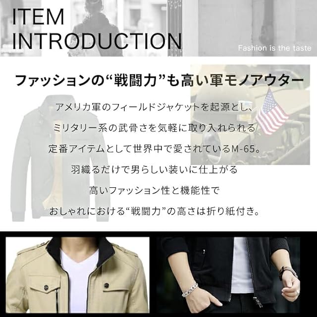 ■快適性:シーズンを問わず快適に過ごせる。 春から秋にかけては薄手タイプが、冬は裏ボア付きの厚手タイプが活躍します。 綿素材は、肌に優しく、長時間の着用でも快適な着心地を提供します。 どんな天候でも対応可能なこのジャケットは、あらゆるシーンであなたを支える頼もしいアイテムです。 ■スタイル:自由度の高いスタイリング。 このジャケットは、ライダースジャケットのような男らしさを保ちつつ、カジュアルからきれいめ、ワイルドなスタイルまで幅広いコーディネイト。 スタンドカラーは首元を暖かく保ちながらも、ジップを上まで閉めることで異なるスタイリングを楽しめます。 ■適用シーン:日常から特別なシーンまで。 日常的なコーディネートから、特別な日のアウトフィットまで、M65ミリタリージャケットはどんな場面でも活躍します。 シンプルで洗練されたデザインは、オフィスカジュアルから週末のアウトドア活動まで、幅広く対応可能。