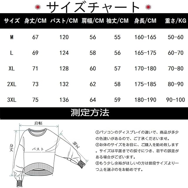 【SIZE:M】身長の目安:160-165cm体重:50-60kg 【SIZE:L】身長の目安:165-175cm体重:60-70kg 【SIZE:XL】身長の目安:170-180cm体重:70-80kg 【SIZE:2XL】身長の目安:175-185cm体重:80-90kg 【SIZE:3XL】身長の目安:180-190cm体重:90-100kg。※寸法は平置きにて計測しておりますので、多少の誤差がある場合がございます。