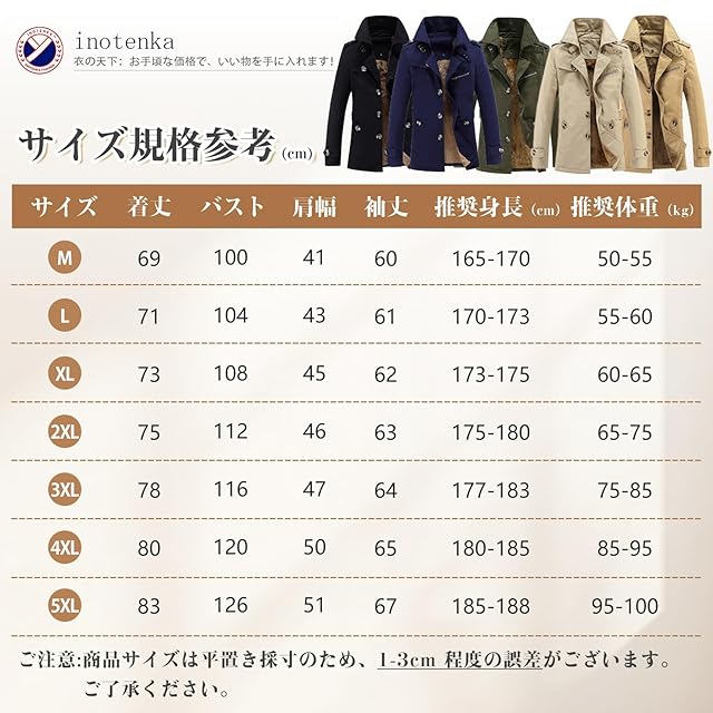 [inotenka] トレンチコート メンズ 大きいサイズ 厚手 冬 ビジネス チェスターコート ジャケット 防寒着 裏起毛 アウター 紳士服 ウインドブレーカー カジュアル アウトドア 登山 通勤 防風 中長丈(2XL カーキ)