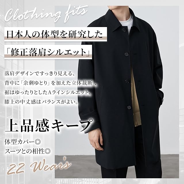 【日本人の体型を研究した「修正落肩シルエット」】「体型カバー」と「スーツとの相性」を両立した一着です。落肩デザインでありながら、肩幅が広すぎない「アジアンサイズ」調整、 小柄な方でも着丈がダブつかず、すっきり見える。背中に「余剰ゆとり」を加えた立体裁断 で、スーツや厚手セーターを着込んでも膨らまず、動きやすく、皺になりにくい。高級感を演出。裾はゆったりとしたAラインシルエット、と膝上の中丈感はスーツとのバランスがよく、かつ上品感をキープ。