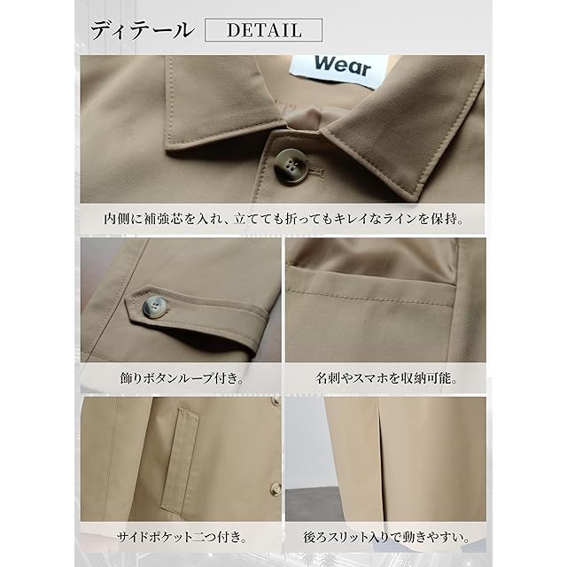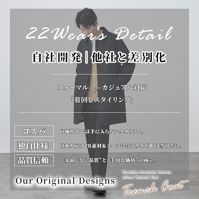 【スーツに重ねて美しい「上質TR素材」】ビジネスシーンではずかしくないトレンチコートを追求し、ビジネスジャケットと同じ高密度TR素材(ポリエステル80%・ビスコース20%) を採用。一般的なポリエステル100%コートとは異なり、光沢感・ドレープ性・通気性 を向上。厚すぎず薄すぎない春秋用最適ウェイト。秋の涼しい日から春先まで、体温調節しやすい適度な防風性と保温性。「スーツの上から羽織っても型崩れせず、ビジネスマンの“品格”をキープ」 ことが当商品の強みです。