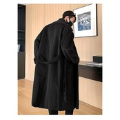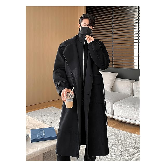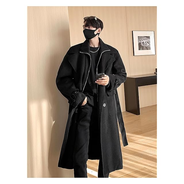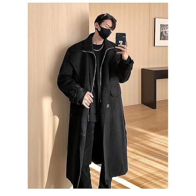 トレンチコート メンズ 黒 ロングでウールのような質感なロングチェスターコートで、イギリス風ファション感があるシンプルなデザインです。
