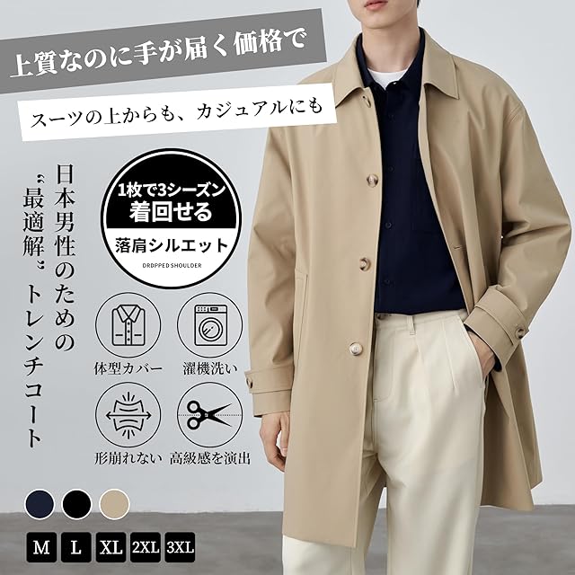 【スーツに重ねて美しい「上質TR素材」】ビジネスシーンではずかしくないトレンチコートを追求し、ビジネスジャケットと同じ高密度TR素材(ポリエステル80%・ビスコース20%) を採用。一般的なポリエステル100%コートとは異なり、光沢感・ドレープ性・通気性 を向上。厚すぎず薄すぎない春秋用最適ウェイト。秋の涼しい日から春先まで、体温調節しやすい適度な防風性と保温性。「スーツの上から羽織っても型崩れせず、ビジネスマンの“品格”をキープ」 ことが当商品の強みです。