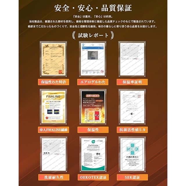 【当店のおすすめポイント!】●宇宙服に採用されている次世代断熱材「エアロゲル」を採用 ● ダックダウン93%相当 ●ダウンパワー350dp相当 ●暖かさが持続立体キルト ●高品質の帝人FWALINEを採用 ●羽毛布団より良い通気·吸湿性 ●ほこり出にくい ニオイが苦手な方ぴったり ●SEK認証·抗菌·防臭·防ダニ加工 ●丸洗いOK!いつでも清潔に ●ピーチスキン加工·なめらかな肌触り ●フィット感アップ42マス ●収納袋付き ●湿気やほこりから布団を守る圧縮梱包採用