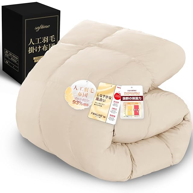 Softime 掛け布団 人工羽毛布団 シングル 冬 ダックダウン93%相当 【宇宙服素材エアロゲル採用 羽毛布団より軽量·保温】 体にフィットする立体キルト 帝人FWALINE使用保温力 肌掛け布団 軽くて暖かい 冬用 掛けふとん あったか ホコリ出にくい 洗える 抗菌防臭 防ダニ 柔らかな肌触り ピーチスキン加工 充填量1.3kg(150x210cm ベージュ)