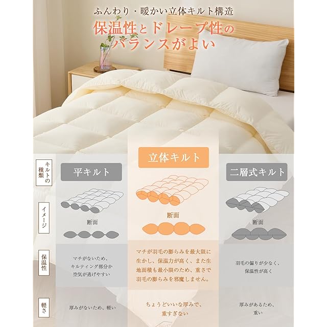 【立体キルト構造・保温性とドレープ性のバランスがよい】立体キルト加工により、お布団と身体の隙間ができにくく、暖かさをしっかり閉じ込めます。肩口から冷気が侵入するのを防ぎ、一晩中暖かさをキープ。さらに、高品質な「帝人FWALINE」を中綿に採用。肌に優しく沿い、ふんわりしなやかに身体を包み込みます。フィット性が高く、寝返りを打っても冷気が逃げにくいので、朝までぐっすりお休みいただけます。