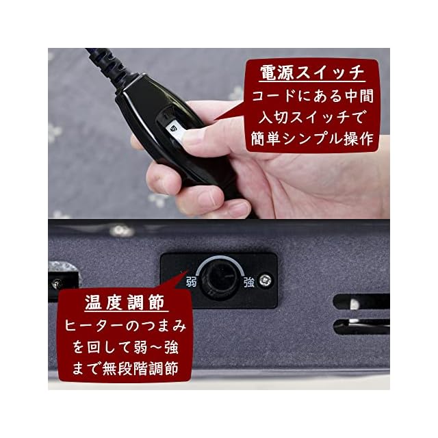 【温度調節】ヒーター温度は、温度調節つまみを回せば弱~強まで無段階での温度調節が可能です。その日の気温や体調に合わせて設定してください。