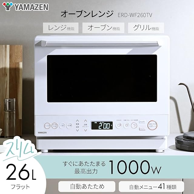 [山善] 電子レンジ オーブンレンジ 26L スリム 1000W フラットテーブル オートメニュー41種 グリル ヘルツフリー ホワイト ERD-WF260TV(W)