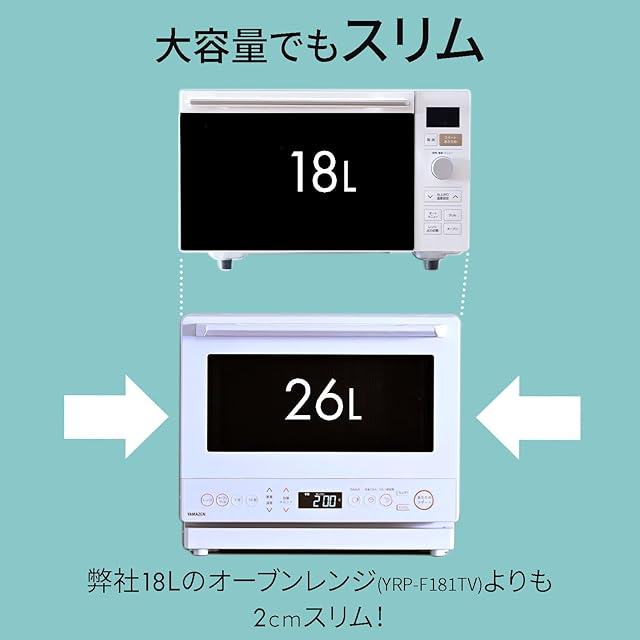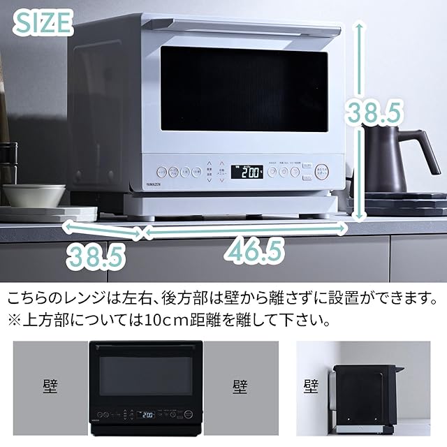 【場所をとらないデザイン】幅は弊社18L(YRP-F181TV)よりも2cm短く、さらにレンジの左右・後方に隙間を空けずに設置できるので、狭いスペースでも設置が可能です。※上方は10cm空けて下さい。