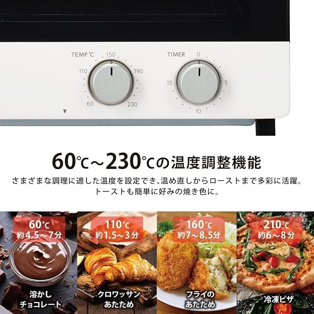 【最大1200Wの高火力&温度調節可能】高火力の1200Wでスピーディに外はカリッと、中はしっとりと美味しいトーストを仕上げます。60℃~230℃の温度調節が可能なので、細かい温度に対応。温め直しからローストまで多彩に活躍。