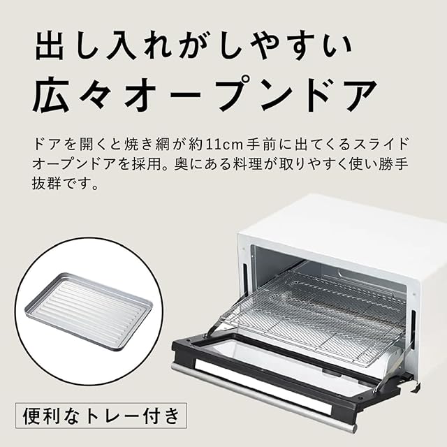 【食材がとりやすい広々オープンドア】奥行がたっぷりで、ドアを開くと焼き網が約11cm手前に出てくるスライドオープンドアを採用。食パンを同時に4枚焼くことができ。また食パンだけでなく、グラタン皿や冷凍ピザもラクラク入る大きさです。