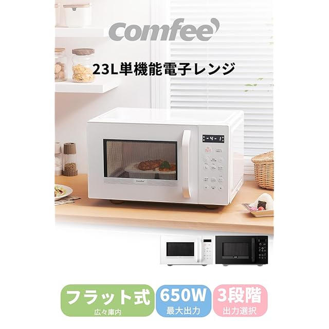 【商品仕様】COMFEE' 23L単機能電子レンジ:◇機能:加熱・解凍・半解凍・消音・チャイルドロック・キッチンタイマー機能付き◇外形寸法:幅496✖奥行400✖高さ303mm、約12.9㎏ ◇庫内寸法:幅306✖奥行347✖高さ204mm◇電源:AC100V、ヘルツフリー ◇出力:200W・500W・650W(65Hzのみ) ◇タイマー:最大89分◇オートメニュー数:13種類※ 製品期間:一年間