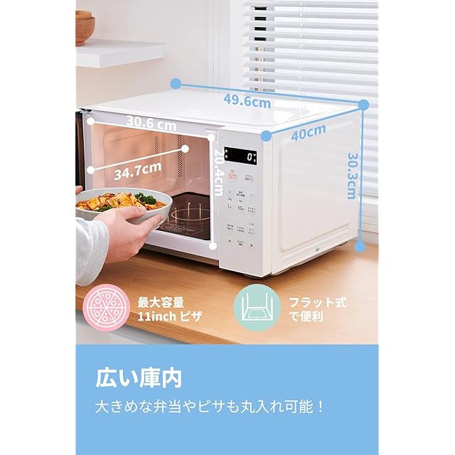 【23Lフラット式広い庫内】この電子レンジは、23Lのフラット式庫内を採用しており、より大きく、出入りがより簡単になっています。幅30.6㎝の庫内は大きなサイズの弁当や11インチのピザも丸入れてあたためことができます。コンパクトでありながら、広々とした内部空間を備えるのが魅力です。