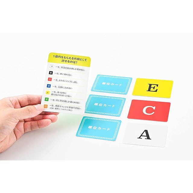 内容: お題カード40枚 順位カード42枚 得点シート1枚 得点コマ6個 説明書