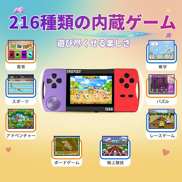 商品名:6-12歳向け ポータブルゲーム機 216種の16ビット知育ゲーム内蔵 3.2インチ画面 WiFi不要 即遊び可能 充電式リチウム電池 4-6時間連続プレイ パズル/数学/冒険/スポーツ/レース/早教手脳協調力向上 子供向けプレゼントに最適 屋内屋外兼用 (紫)