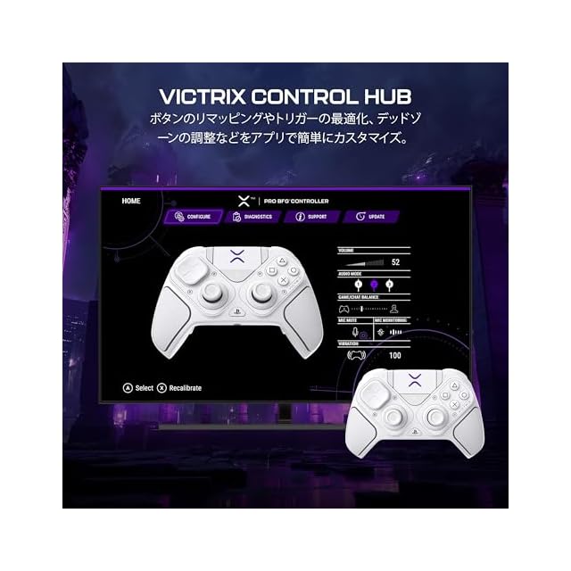 【有線・無線対応&専用アプリで拡張性◎】 最大9mの低遅延ワイヤレスとUSB-C有線接続に対応し、最長20時間の連続使用が可能。PC用Victrix Control Hubアプリでボタン設定やトリガー調整、ファームウェア更新も自在に行える