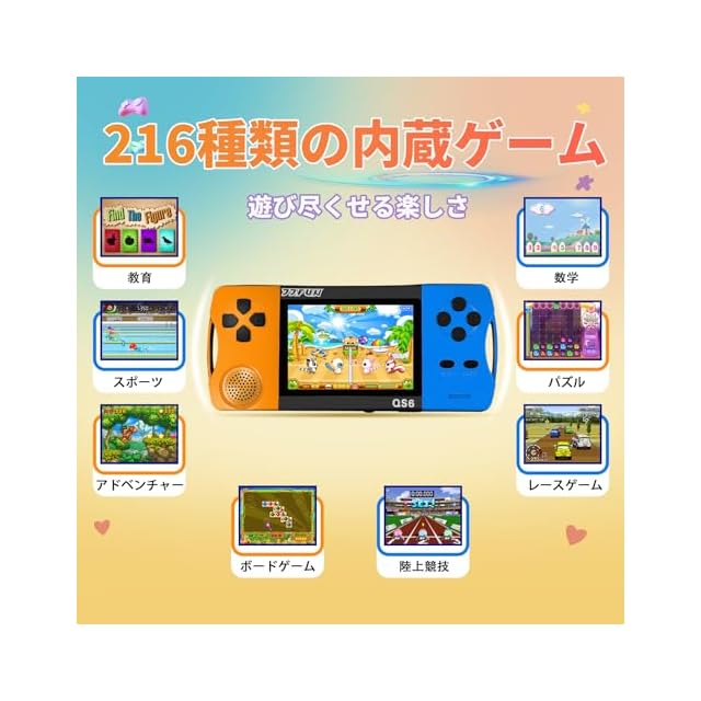 商品名:6-12歳向け ポータブルゲーム機 216種の16ビット知育ゲーム内蔵 3.2インチ画面 WiFi不要 即遊び可能 充電式リチウム電池 4-6時間連続プレイ パズル/数学/冒険/スポーツ/レース/早教手脳協調力向上 子供向けプレゼントに最適 屋内屋外兼用 (オレンジ)