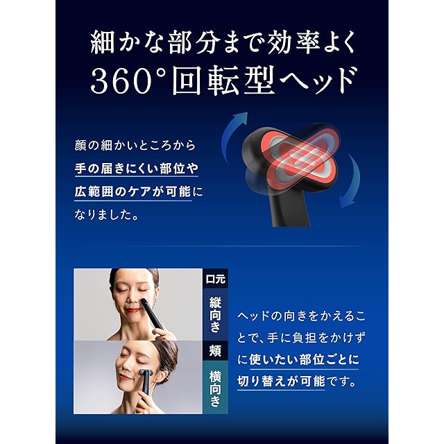 【360度回転ヘッド】REFINE EYEのヘッドは360°回転するため、顔の細かいところから手の届きにくい部位や広範囲のケアが可能に!ヘッドの向きを変えることで、手に負担をかけず使いたい部位ごとに切り替えができます。
