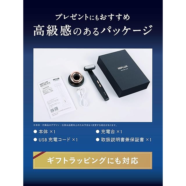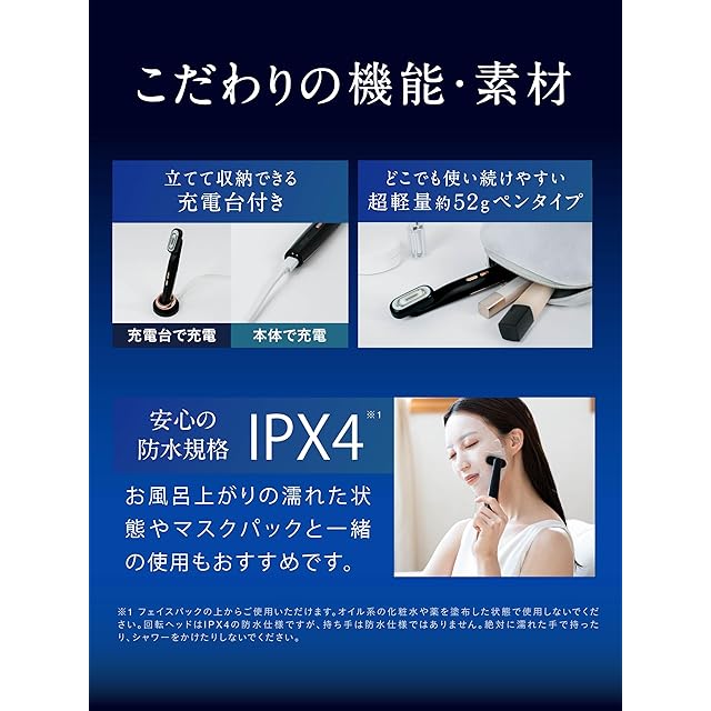【REFINE EYEこだわり機能】・立てて収納できる充電台付き。・超軽量:約52g。・安心の防水規格:IPX4。・肌検知機能:肌に触れると自動開始。・使用可能部位:フェイスライン、口元、目元、こめかみ、額、デコルテ。