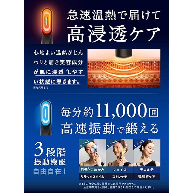 【温熱&高速振動で素肌美引き出す】内側から温めることで、明るくスッキリとした印象に。部位や肌悩みによって自由にレベル変更できる振動機能で、普段あまり動かすことがない筋肉のトレーニングが可能に!