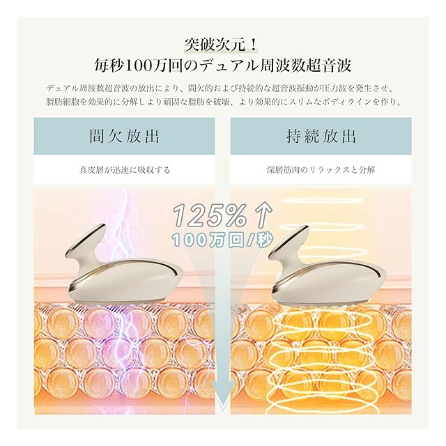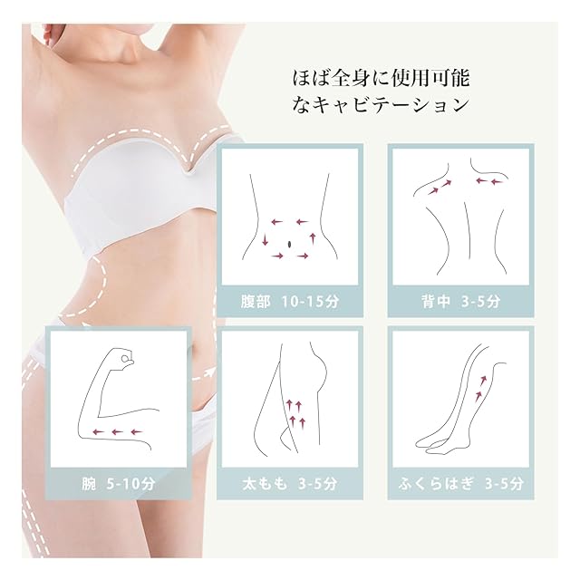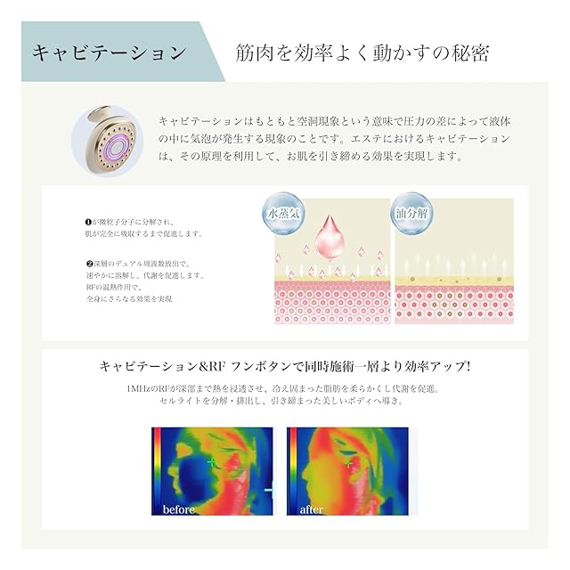 【超音波キャビテーション】キャビテーションとは、圧力差によって液体中に気泡が発生する現象です。この原理を活用して、エステでお肌を引き締める効果を実現します。さらに、EMS技術により、筋肉運動を効率的にサポート。普段あまり使わない部位の筋肉にも届き、より効果的に引き締めが可能です。