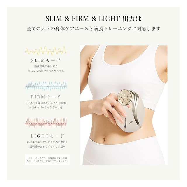 【3種類モード+5段階調節】目的・肌質に合わせてカスタマイズ SLIM・FIRM・LIGHTの3モードで、トレーニングのニーズに合わせて、最適なモードを選択し、身体をケアしましょう。*初心者は初めにレベル|から使用して、慣れたら徐々にレベルを上げていくことをお徹めします