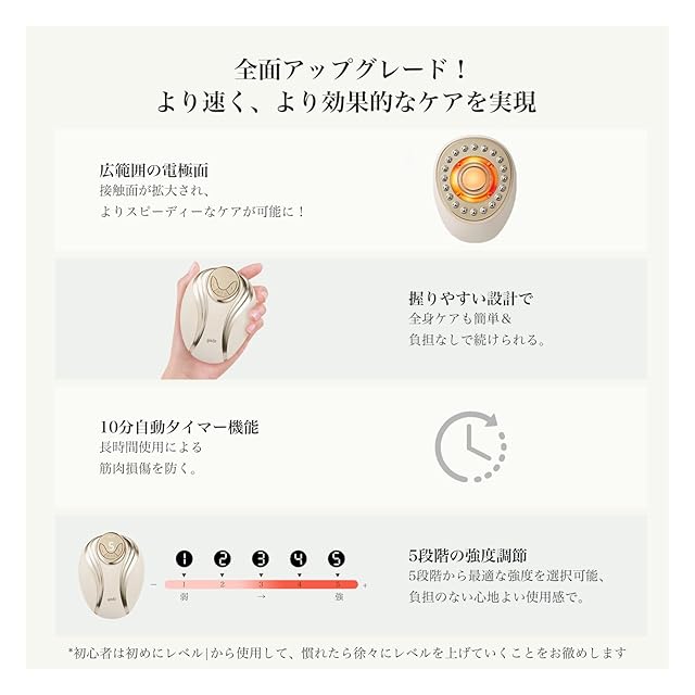 【使いやすさも抜群】 広い電極面&自動停止機能 接触面が拡大され、よりスピーディーなケアが可能に! 初心者は初めにレベル1から使用して、慣れたら徐々にレベルを上げていくことをお勧めします。