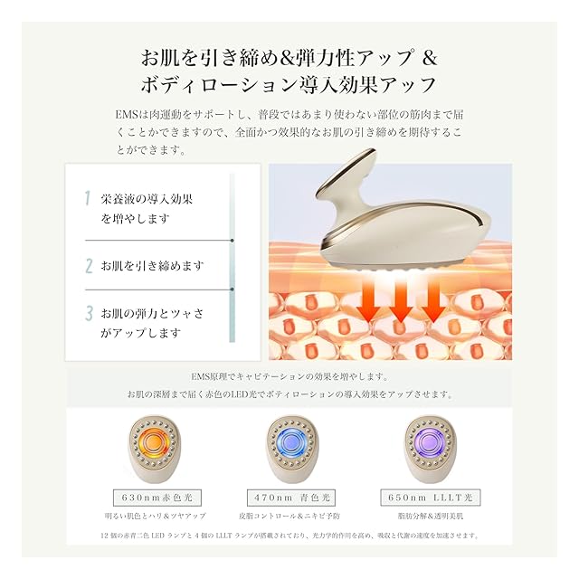 【栄養液導入効果アップ(RF高周波)】 当キャビテーションには、最もお肌の深層まで届くことができる赤色のLEDを搭載しており、赤色LEDの特性を利用し、ボディローションなどの栄養液と配合で使うと、効果的にボディローションの導入効果をアップさせることができます。 引き締め&EMS効果でプロ級フィットネス高周波熱でコラーゲン再生を促進、肌のハリと弾力をアップ。