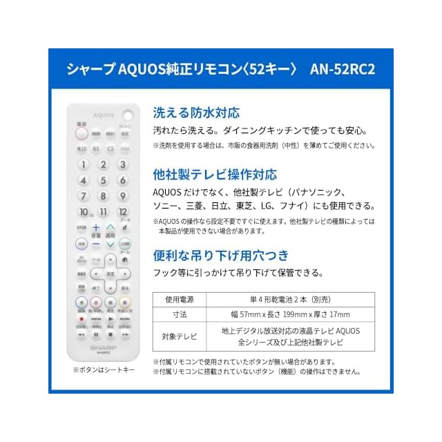シャープ AQUOS純正リモコン AN-52RC2 ホワイト 防水