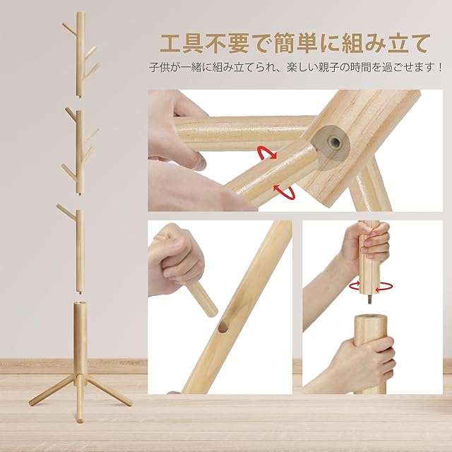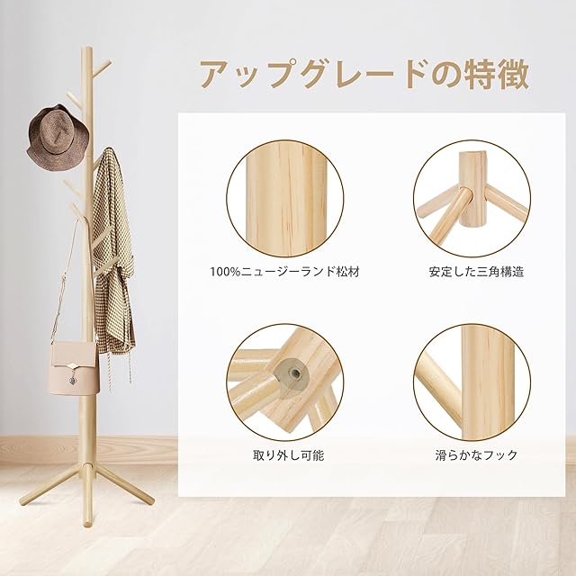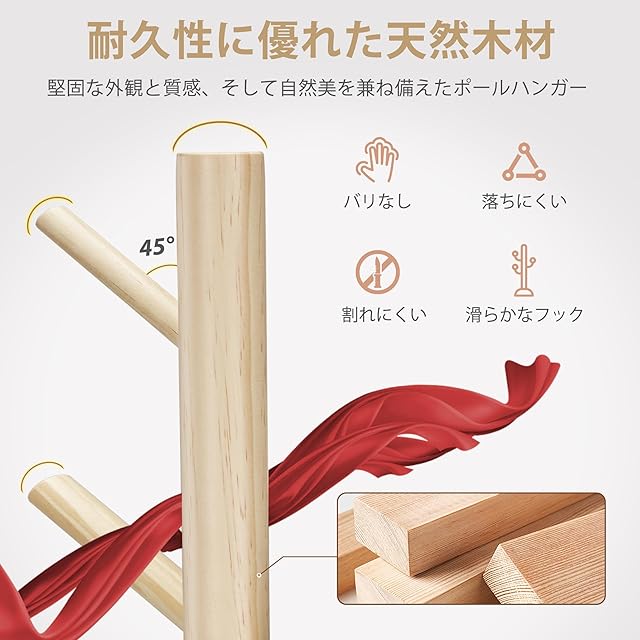 【高品質な木材】Azaeahomのポールハンガーは、ニュージーランド産の松材を使用しており、自然な質感と耐久性を持っています。北欧風やモダンなスタイルの部屋にぴったり合います。また、木材は頑丈で、バリのない無垢材が手に優しく保護します。