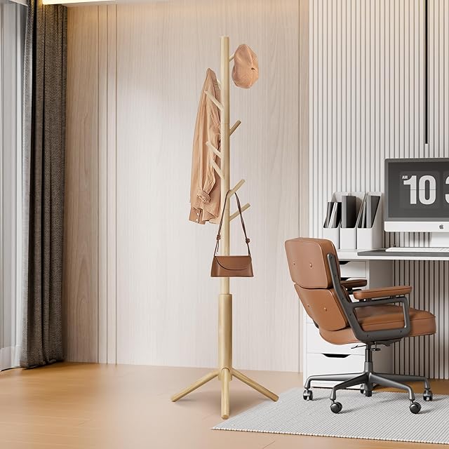 ポールハンガー 木製 衣類収納 コートハンガー 洋服ラック Azaeahom 40kg耐荷重 ハンガースタンド 枝型フック設計 高さ175cm 3段高さ調節可能 フック8個 組み立て簡単 ネジ式 倒れ防止 リビング 寝室 (木の色)
