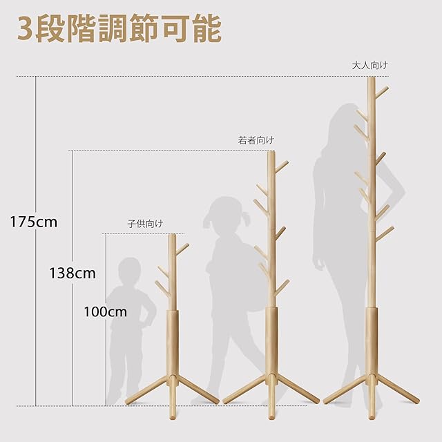 【3段階の高さ調整】175cmの高さで3段階の調節が可能です。家族全員が快適に使える設計で、特に成長中の子供に合わせてフックの高さを変えることで、長期間にわたって愛用できる柔軟性があります。子供には2段階(100cm)、青少年には3段階(138cm)、大人には標準の4段階(175cm)が適しています。家族全員のニーズに応じて使い分けできるのが大きな魅力です。