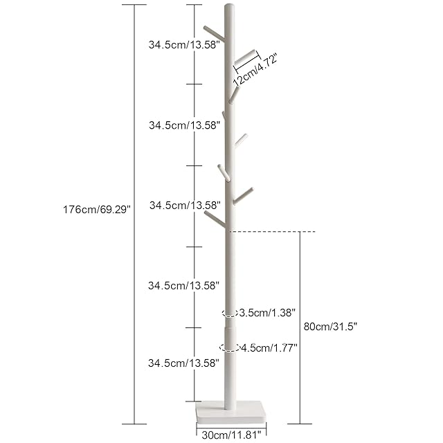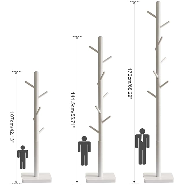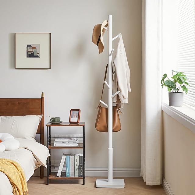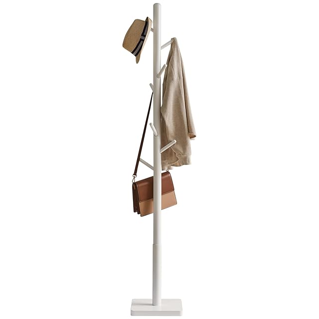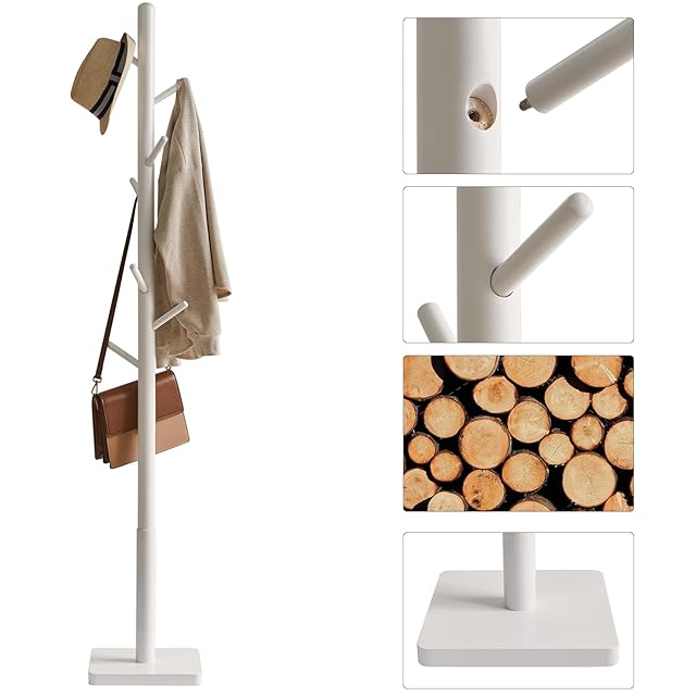 YMYNY ポールハンガー 木製 ラバーウッド 安定スクェアベース 高さ三段階調節 8つフック 組み立て簡単 コンパクト 帽子・かばん・洋服掛け 約29x29x176cm コートハンガー ハンガースタンド ホワイト JPHCR002W