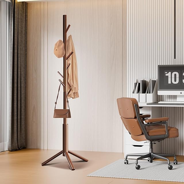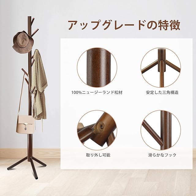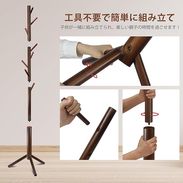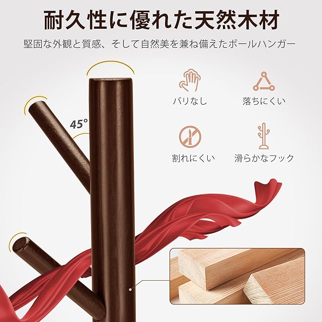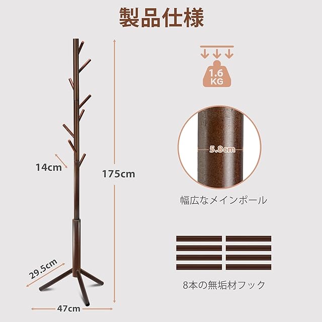 ポールハンガー 木製 衣類収納 コートハンガー 洋服ラック Azaeahom 40kg耐荷重 ハンガースタンド 枝型フック設計 高さ175cm 3段高さ調節可能 フック8個 組み立て簡単 ネジ式 倒れ防止 リビング 寝室 (ブラウン)