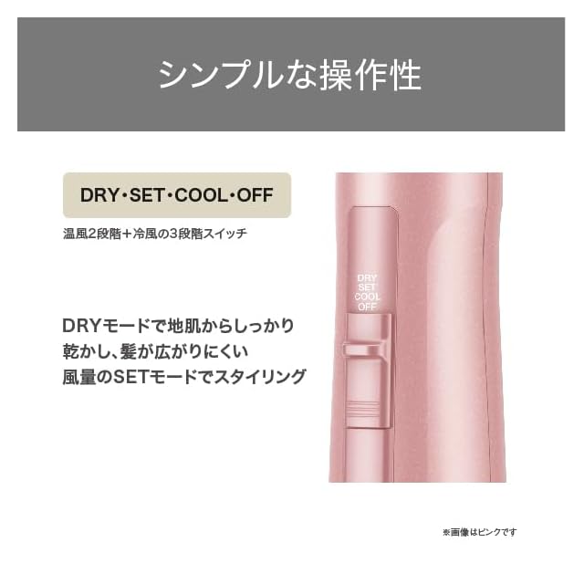 操作しやすい3段階の切替スイッチは、「DRY」モードで地肌からしっかり乾かし、髪が広がりにくい風量の「SET」モードでスタイリングを。「COOL」モードで冷風に。「DRY」、「SET」モードは温風2段階の調節が可能です。