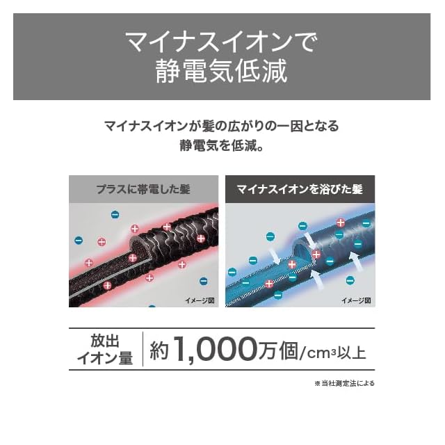 ブラッシングしながらマイナスイオン※が髪全体に行き届き、髪の広がりの一因となる静電気を低減します。※放出イオン量 約1,000万個/cm3以上 / 当社測定法/当社比較検証法による