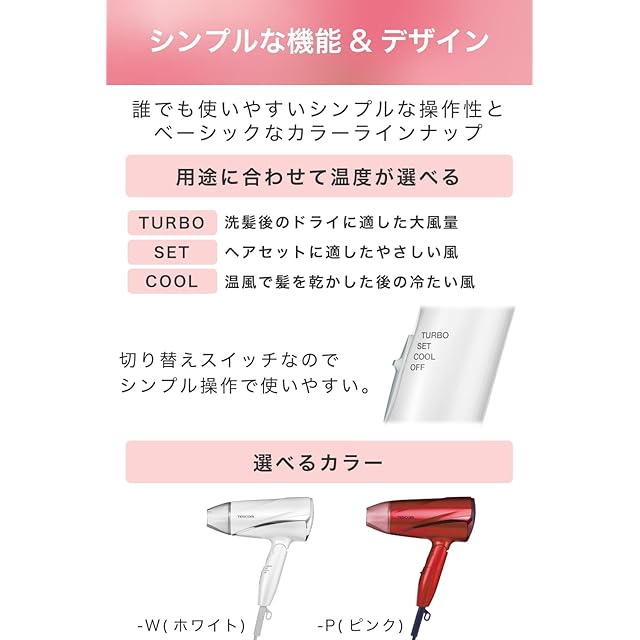 忙しい朝も便利な大風量タイプ。毎日のドライがスピーディーに。※スイッチポジションTURBO使用時 軽量タイプだから、毎日使いでも疲れにくく、らくらく使えます。ファミリーユースにぴったり。