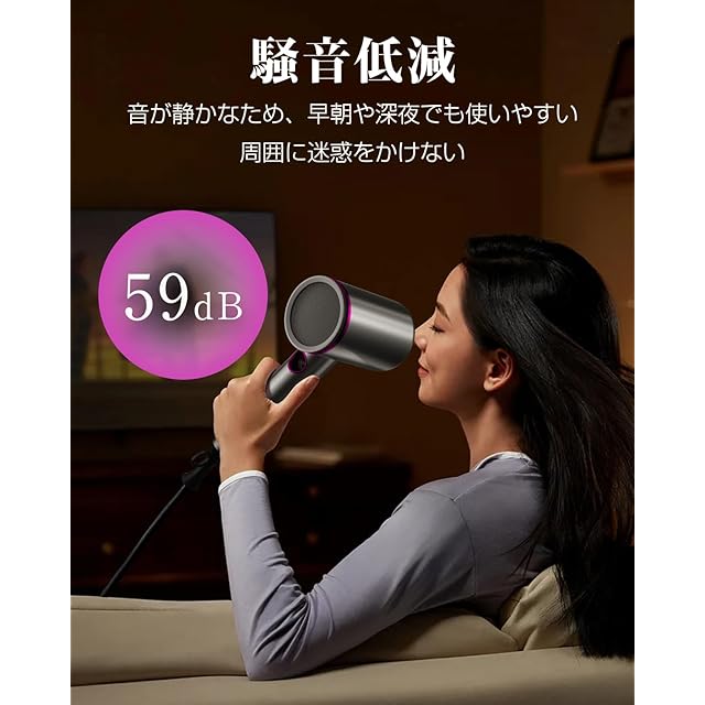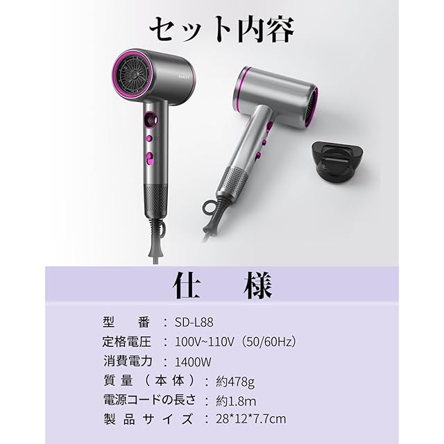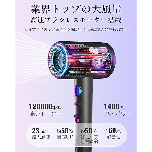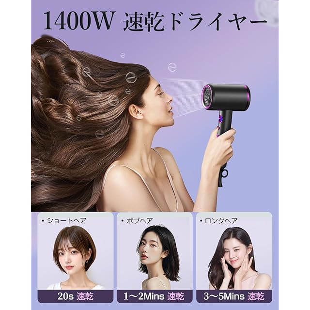 【1400W大風量&速乾】僅か数分間以内で、根元から髪を素早く乾燥させることができます。●髪に熱を当てる時間を短縮できるため、ダメージを抑えられます。特に夏の暑い時期も、快適に髪を乾かせます。バランスのよい風で、速く乾かし、美しく仕上がります。1400W大風量がある一方、電気の消費量が低くて、電気代が節約できます。
