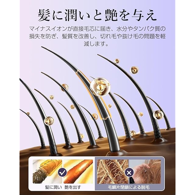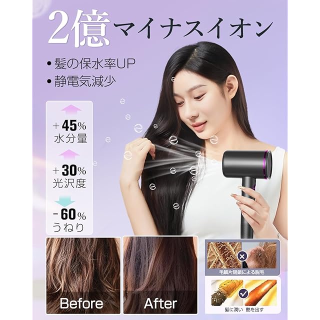 【2億高濃度マイナスイオン】髪にやさしいマイナスイオンを発生。髪をいたわりながら乾かします。静電気の発生を抑えてくれるので、髪の潤いを保ち、ダメージを最小限に抑えます。パサつきや切れ毛、髪の広がりで悩んでいる方におすすめです。