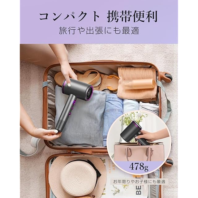 【超軽量&コンパクトサイズ】重量はわずか478gで、多くのドライヤーよりも軽いため、腕への負担を軽減し、長時間の使用でも疲れません。さらに、コンパクトなサイズで収納が簡単です。カバンに入れても負担がないので、旅行や出張先に手軽に持って行けます。