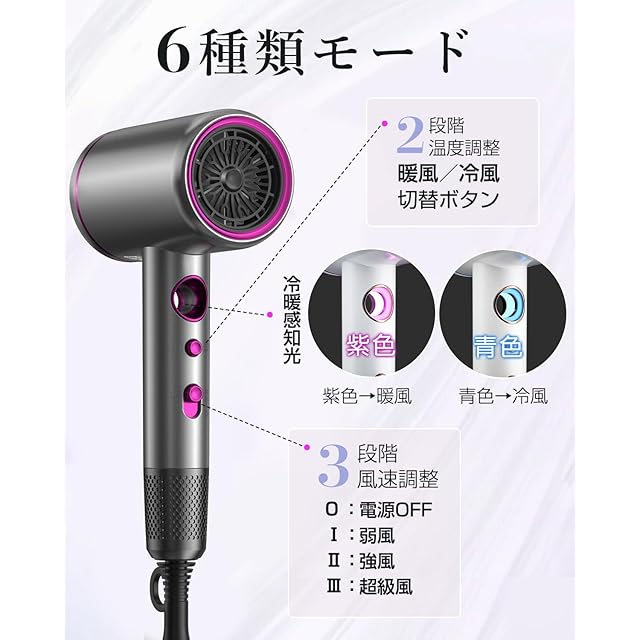 【6段階種類モード&冷熱風切替&3つ風速】切替スイッチで、暖風、冷風と3段階風速で調節可能なので、合計6種類モードで用途に応じた使い分けができます。 ●冷風「I 、II、III」3つ風速あり、暖風「I 、II、III」3つ風速あり、温度と風量が細かく調整できます。 ●自分の髪質にあった温度のドライヤーモードを選ぶことで、髪を熱ダメージから保護できす。